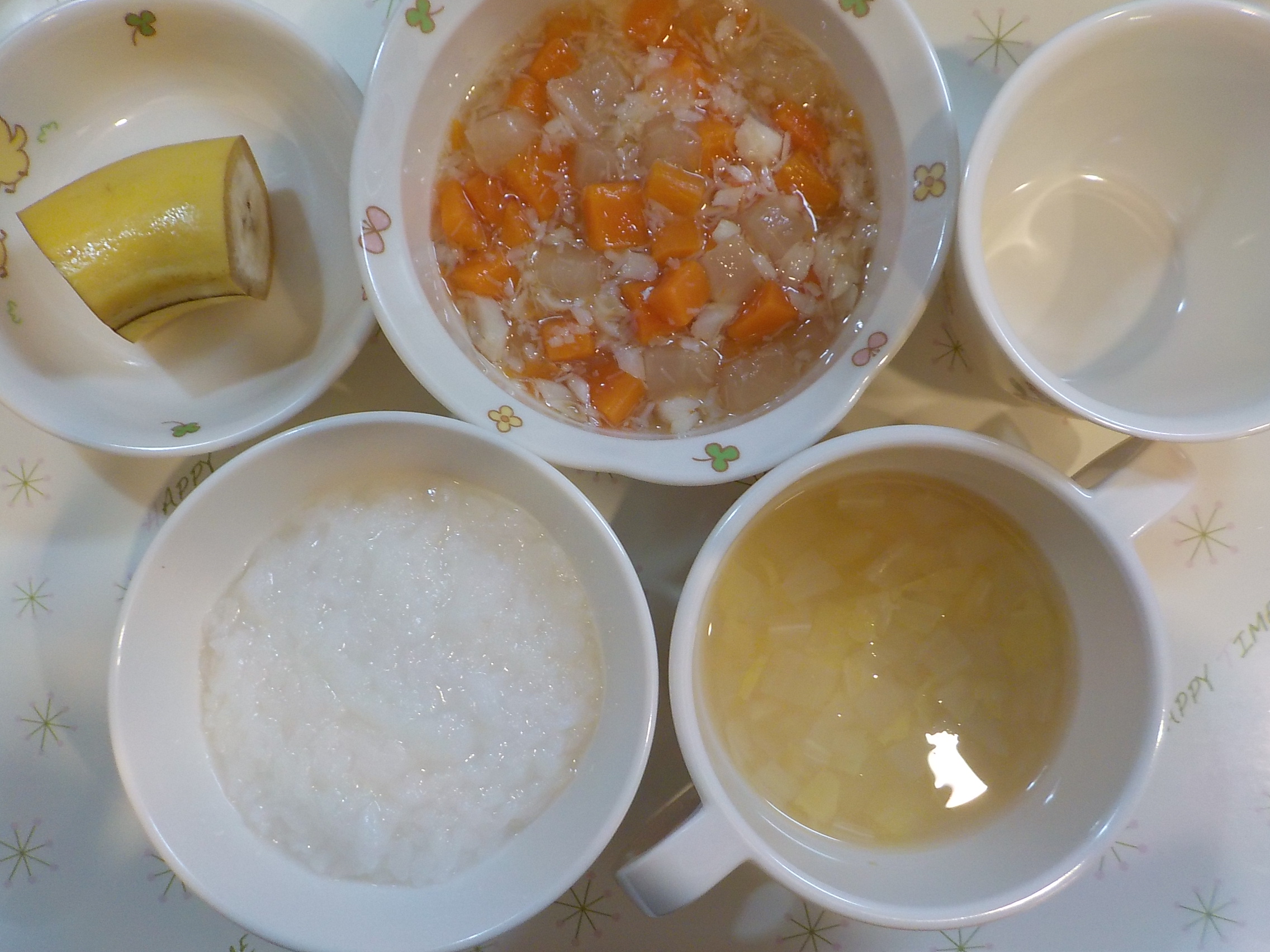 5倍粥 魚の二色野菜煮 みそ汁 果物