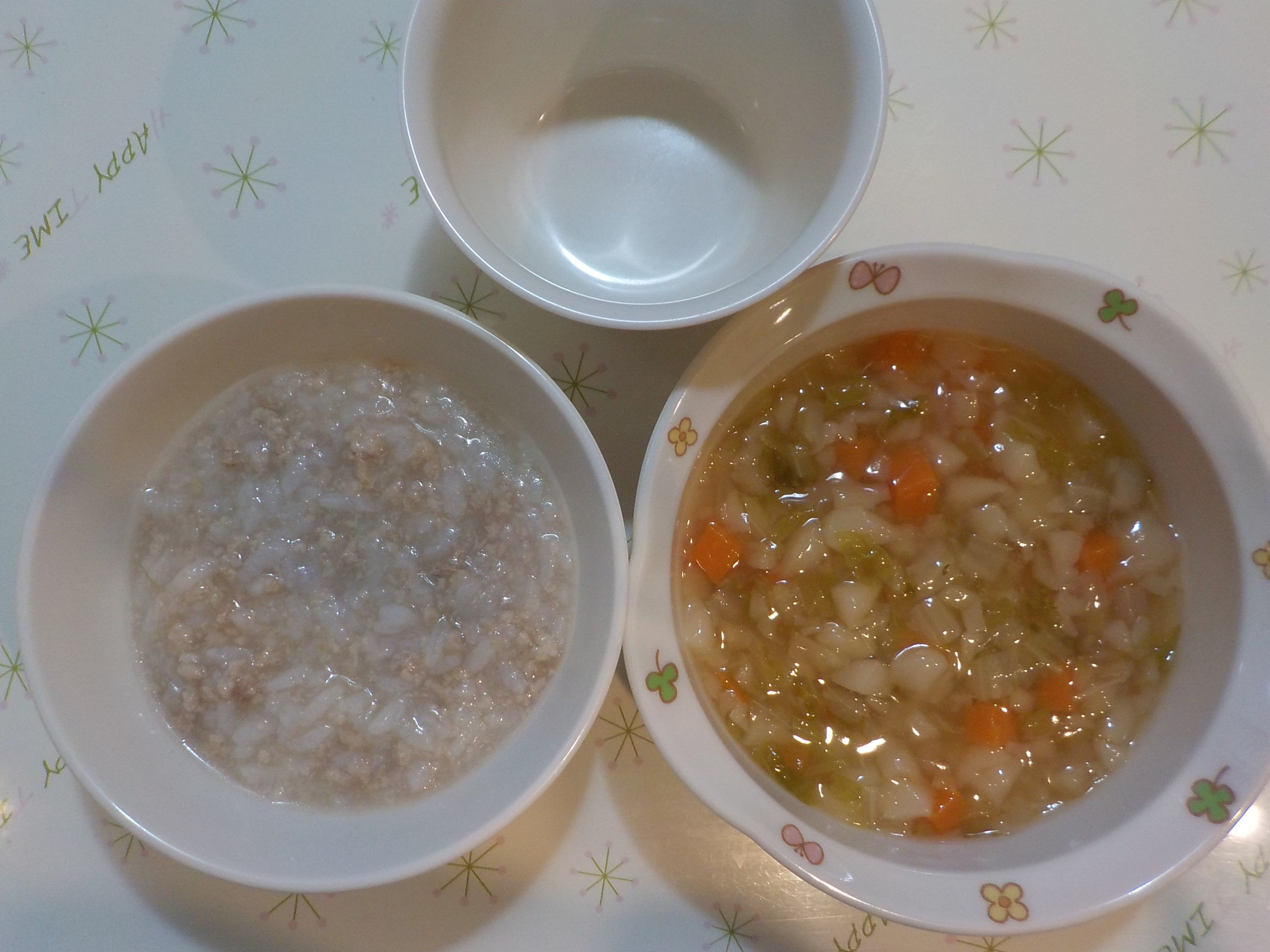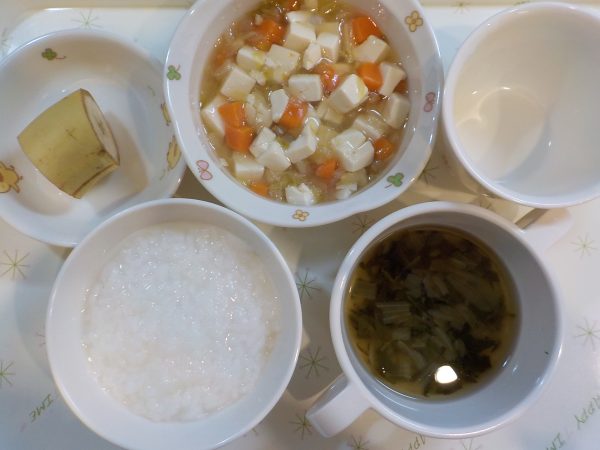 5倍粥 豆腐と野菜の煮物 清汁 果物