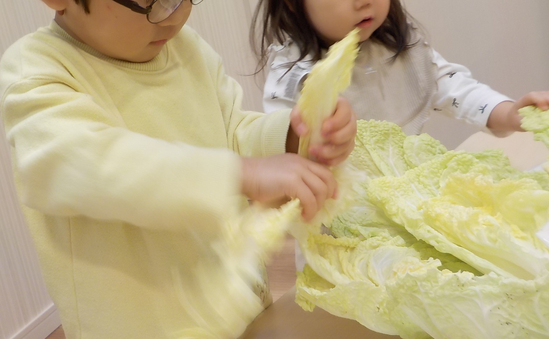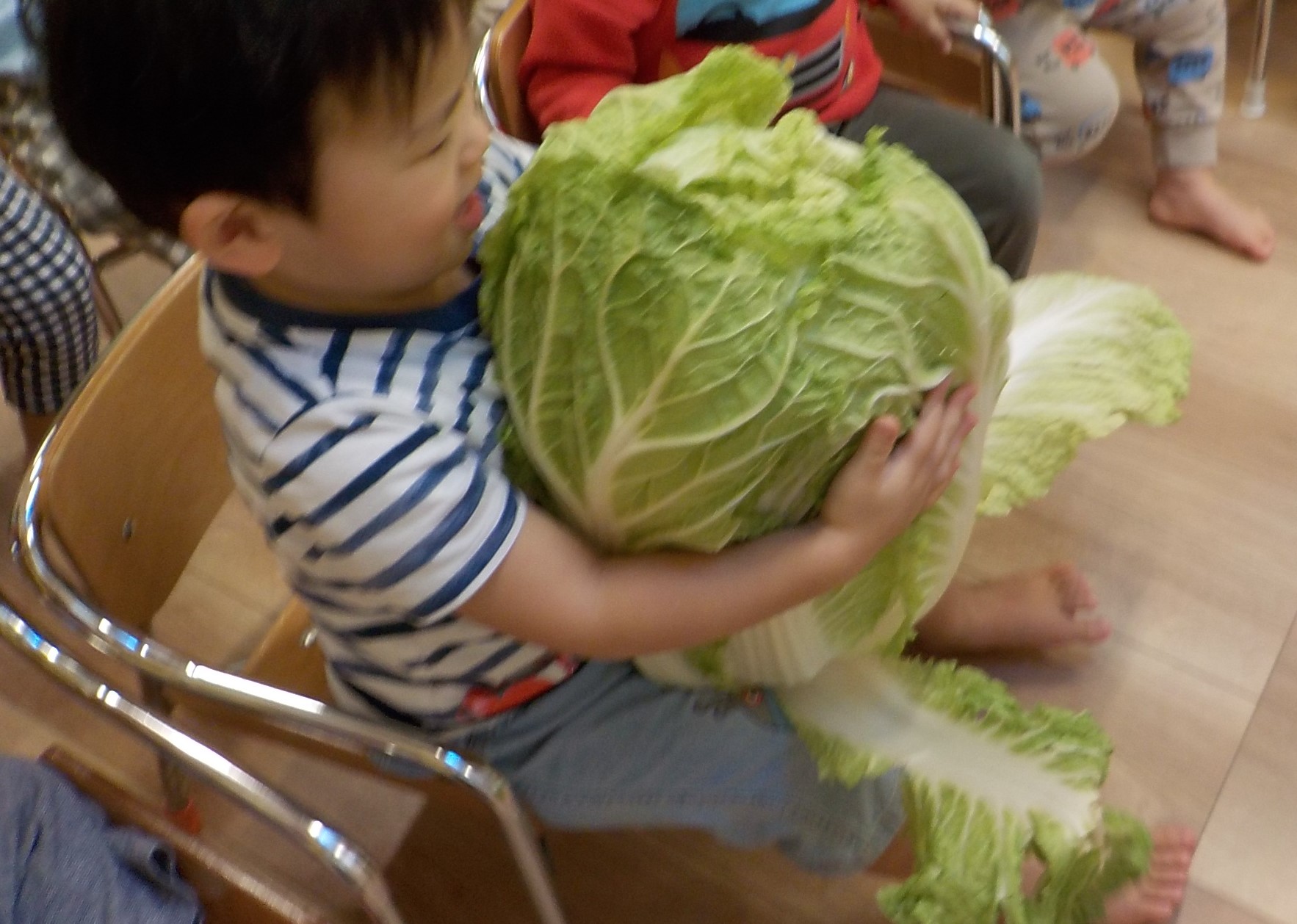 子どもたちは、大人の顔2つ以上あるとても大きな白菜を見て驚きと、ワクワクとした顔をしていました。