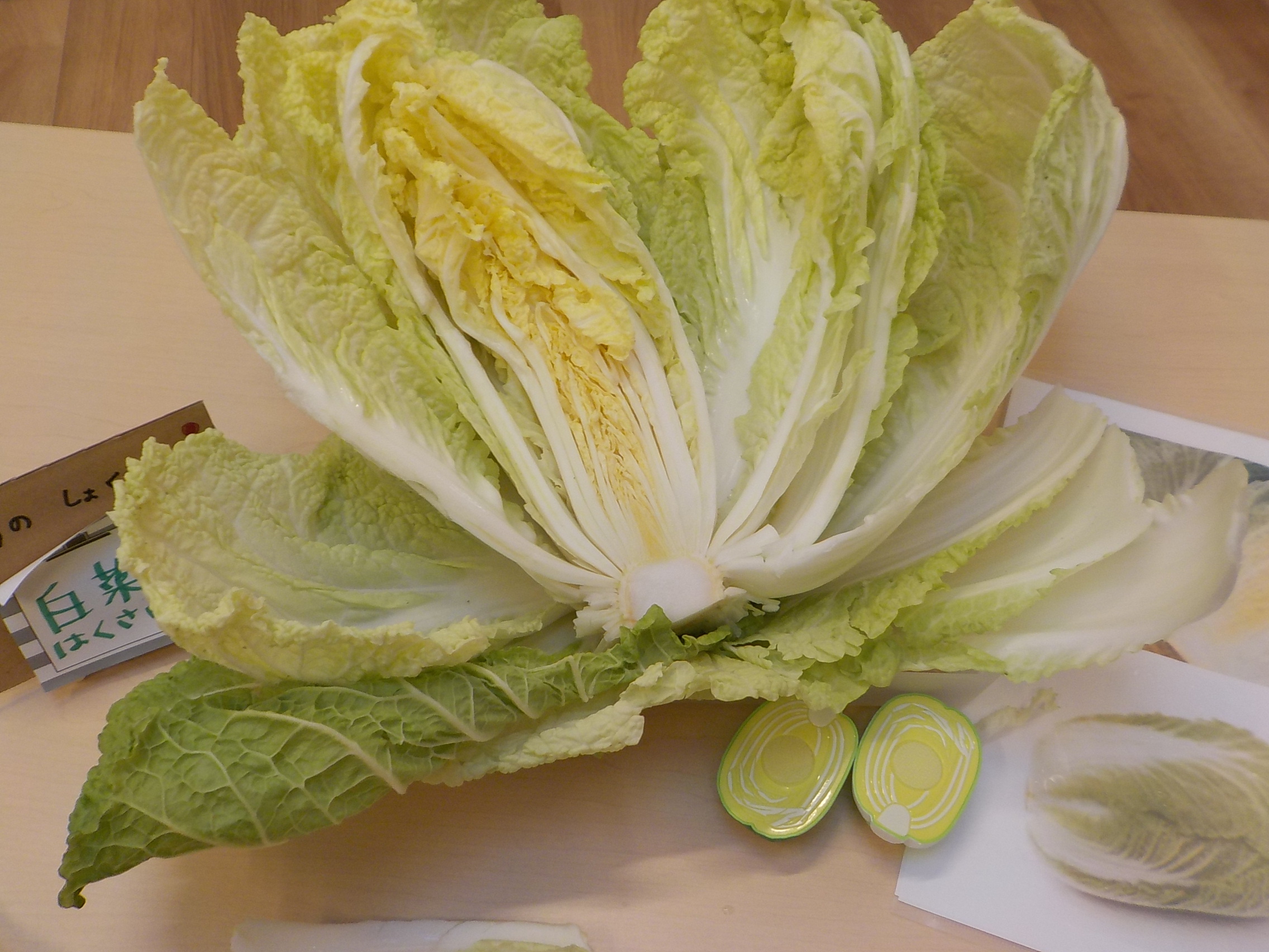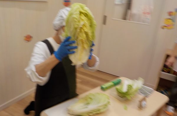 大きな白菜も半分に切ってみました。調理師の手にかかるとザクザクっといい音を立てて切れました。