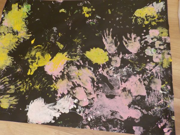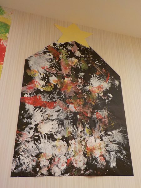 今回はクリスマスがテーマだったので、黒い模造紙に白色のペイントをペタペタ・・・!