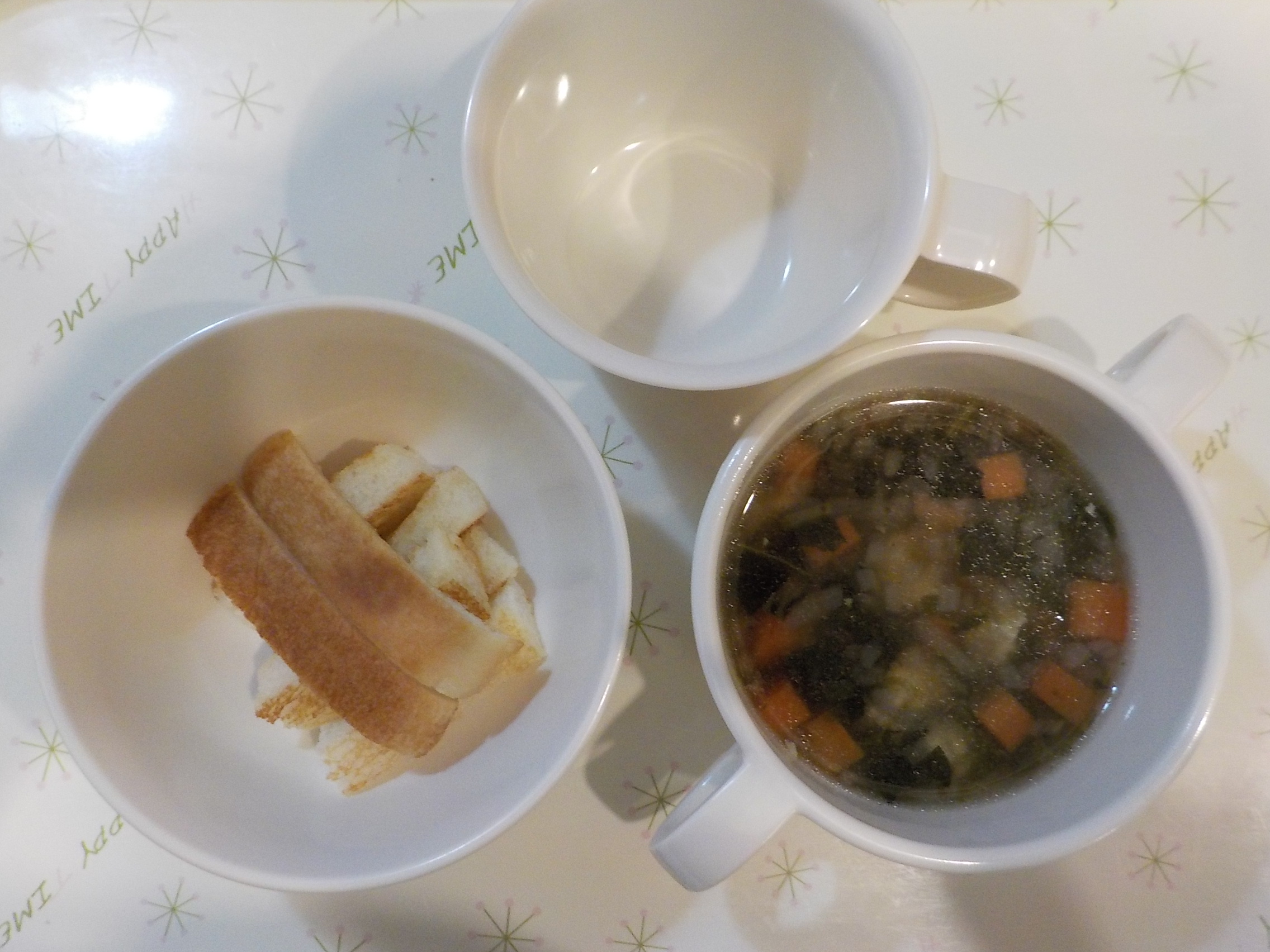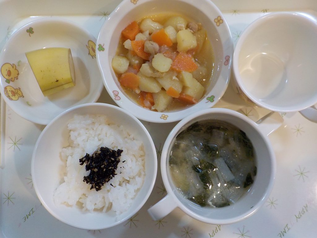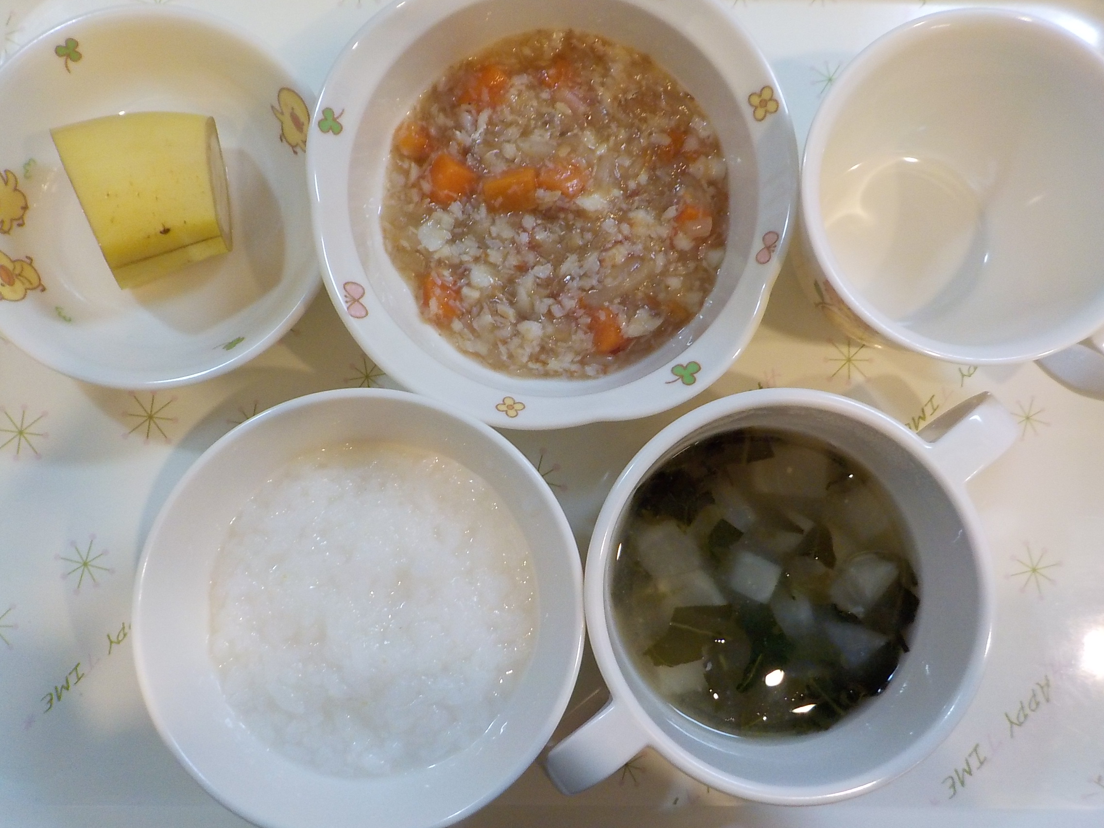 5倍粥 魚と野菜のおかか煮 みそ汁 果物