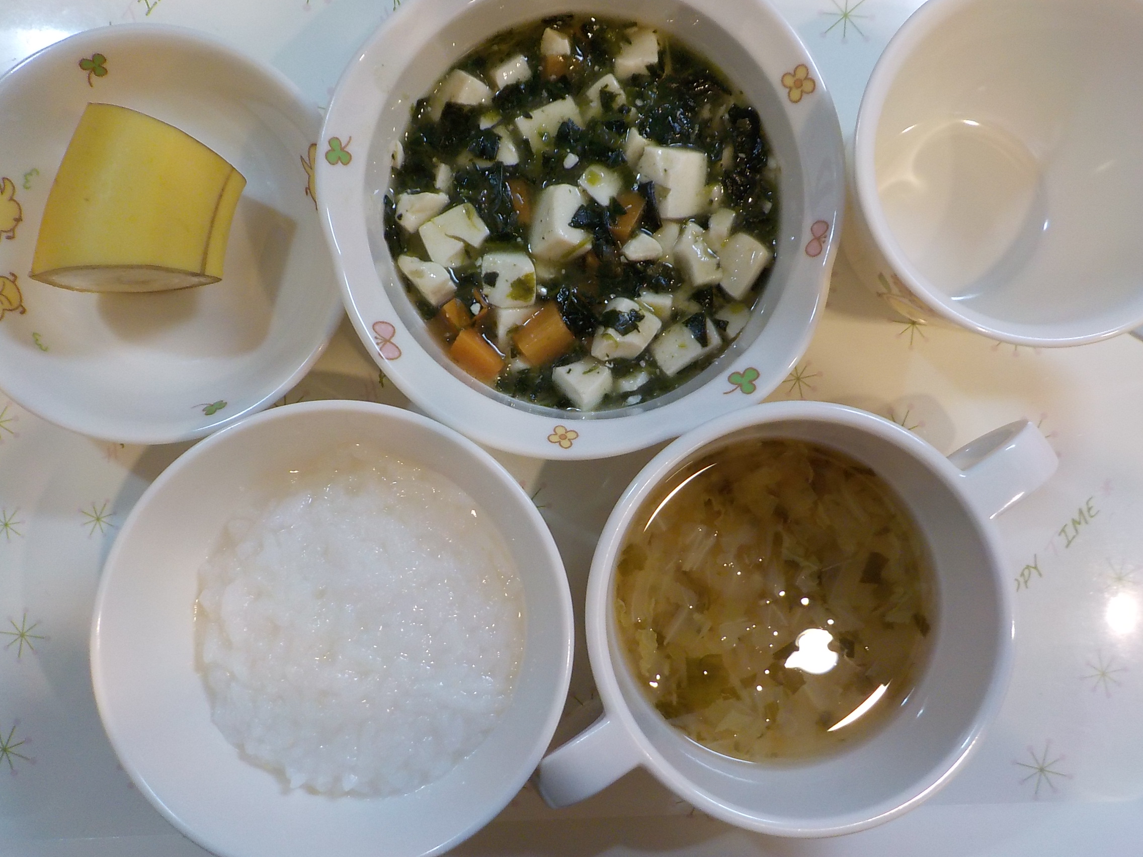 5倍粥 豆腐と野菜のみそ煮 清汁 果物