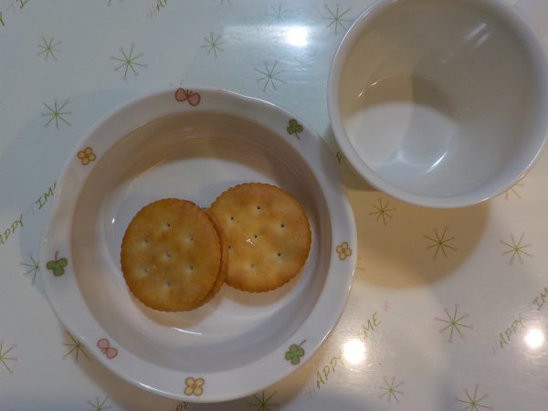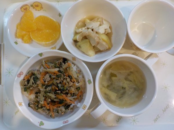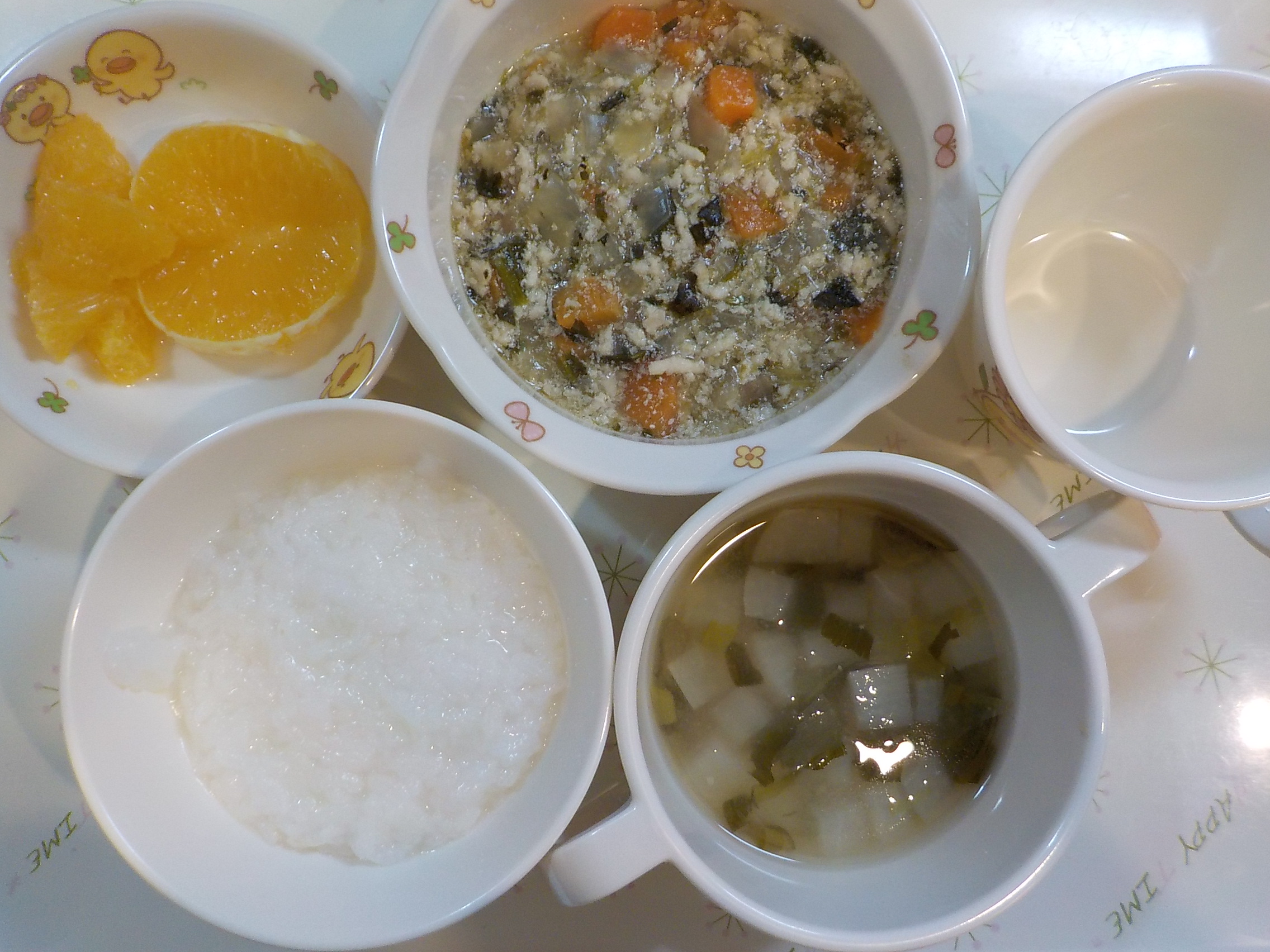 5倍粥 鶏肉の三色野菜煮 みそ汁 果物