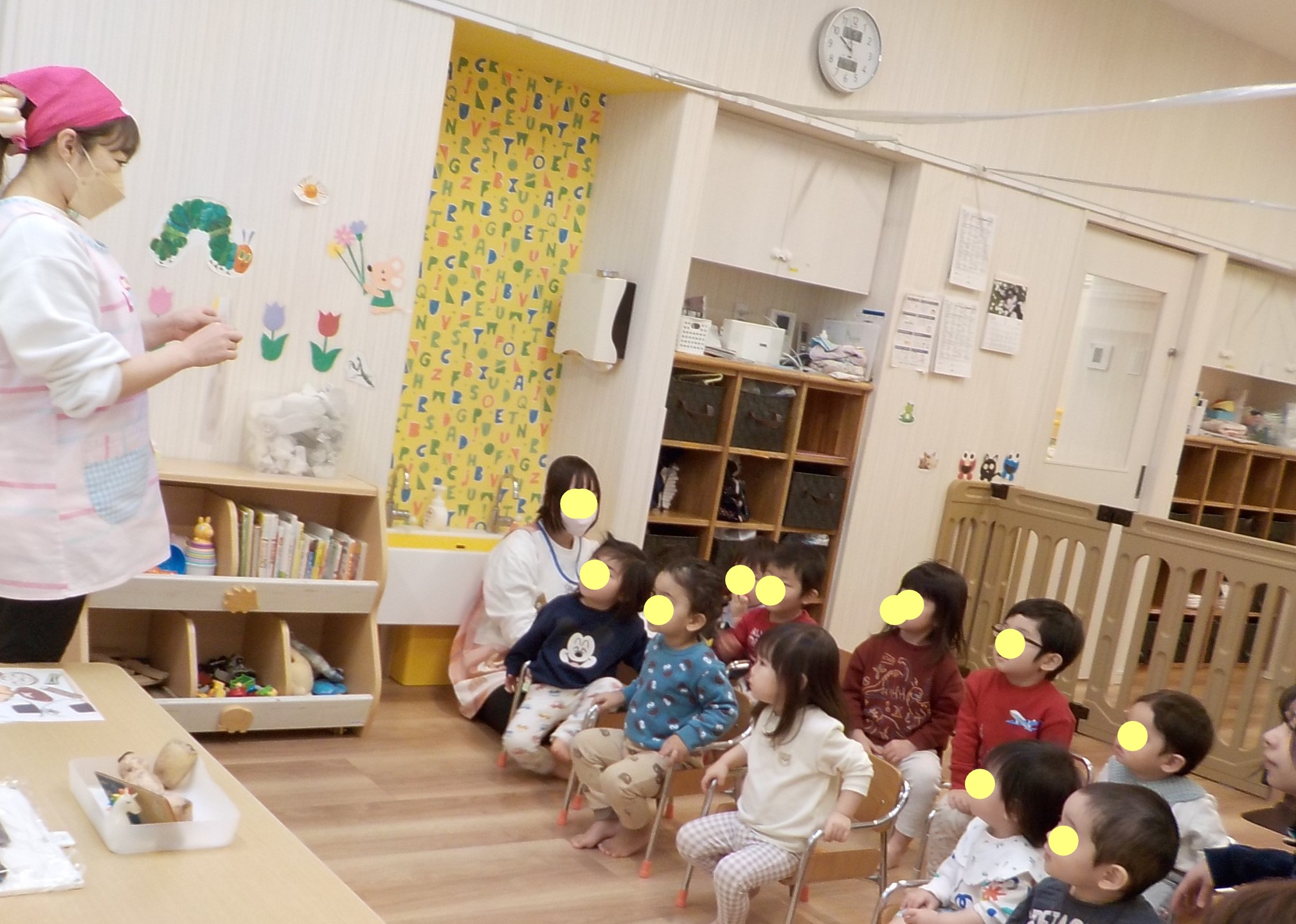 食育が始まると、ひよこ組のお友だちも全員が椅子に上手に座って観賞できました。