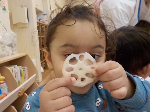 子どもたちも楽しんでいました。匂いを嗅いでみたり、ピーラーで切った皮を触ってみたり・・・