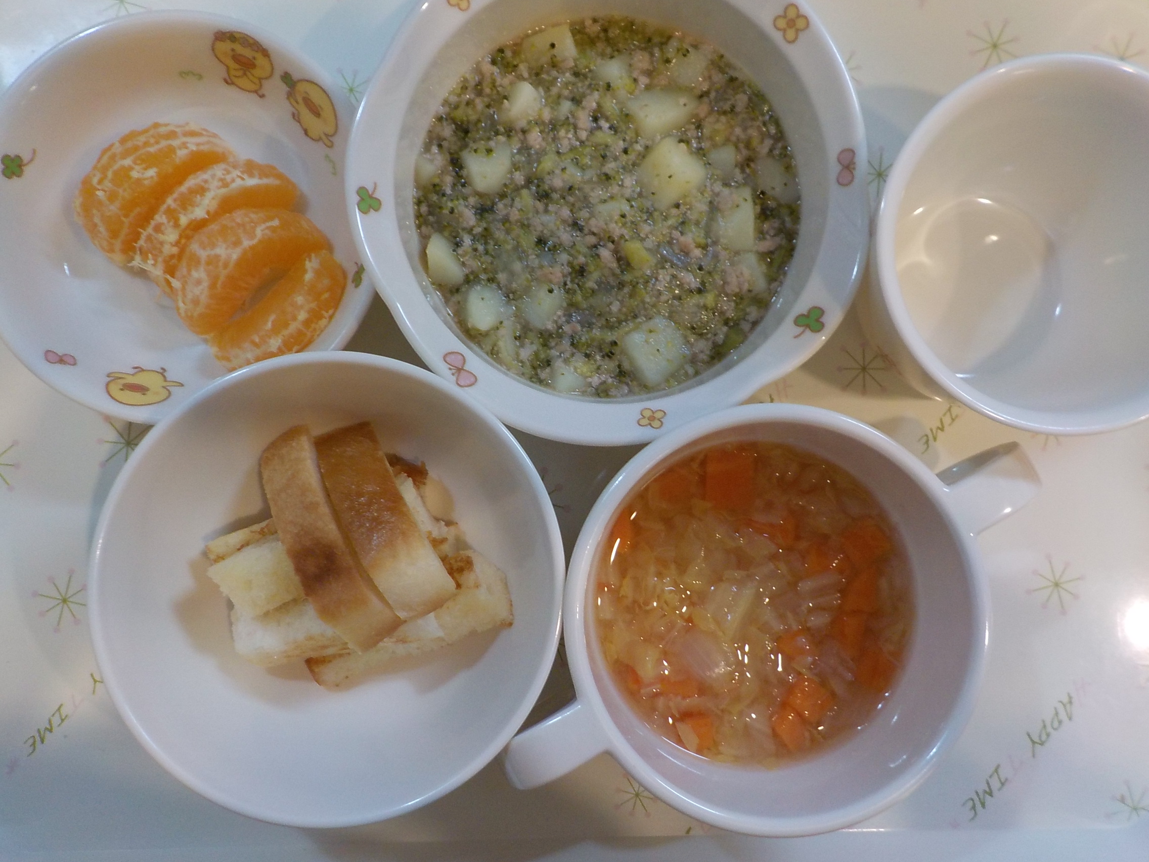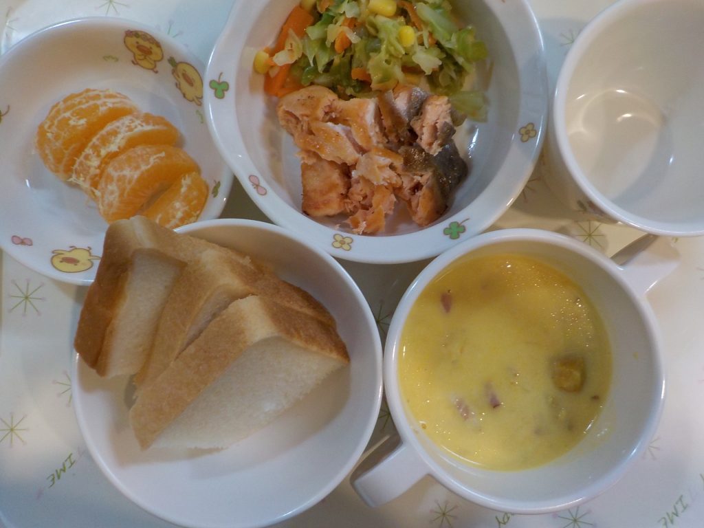 幼児食 パン 魚のムニエル キャベツとコーンのサラダ かぼちゃのスープ 果物 離乳食 トースト 豚肉と野菜の煮物 はくさいスープ 果物 幼児食(おやつ) おかかおにぎり 離乳食(おやつ) べびーせんべい