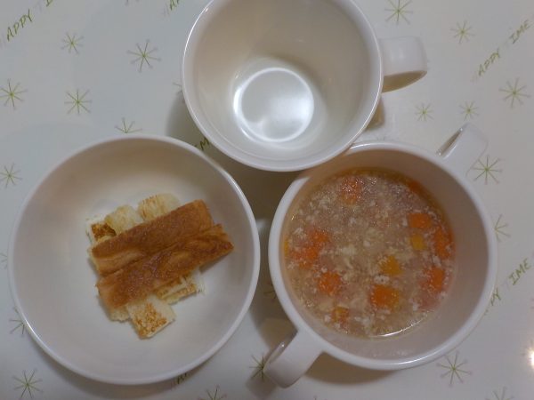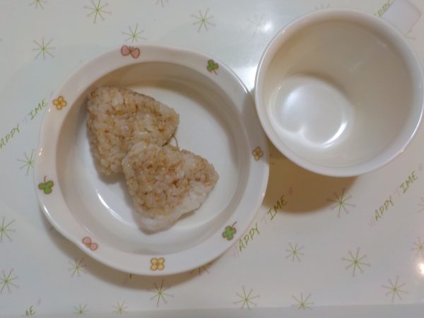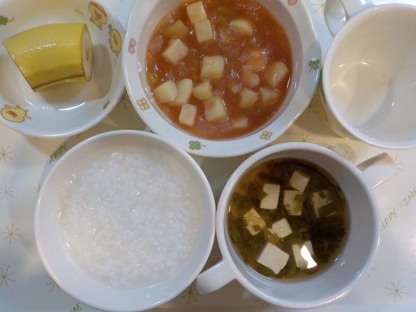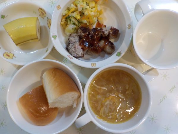 【給食】 パン ハンバーグ キャベツのコールスロー オニオンスープ 果物 【おやつ】 おかかおにぎり 【離乳食】 5倍粥 じゃが芋のトマト煮 豆腐スープ 果物 【離乳食おやつ】 トースト 鶏肉の野菜スープ
