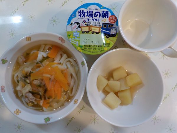 五目うどん じゃが芋の甘煮 ヨーグルト
