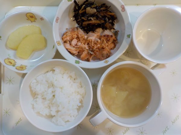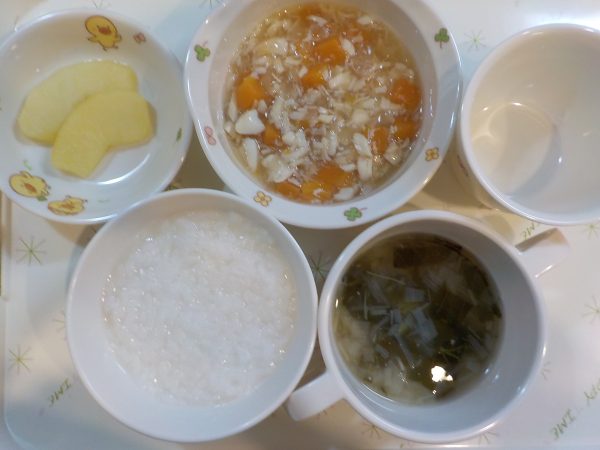 5倍粥 魚と野菜の煮物 味噌汁 果物