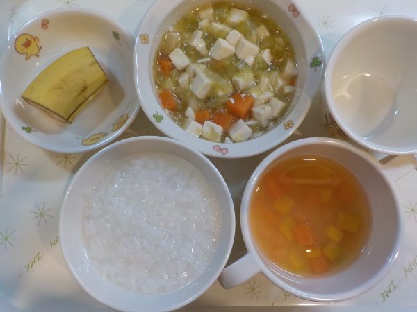 5倍粥 豆腐と野菜の煮物 南瓜のみそ汁 果物