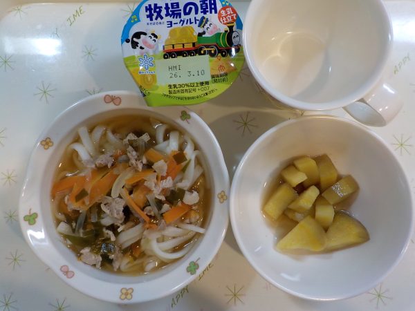 肉わかめうどん さつま芋の甘煮 ヨーグルト